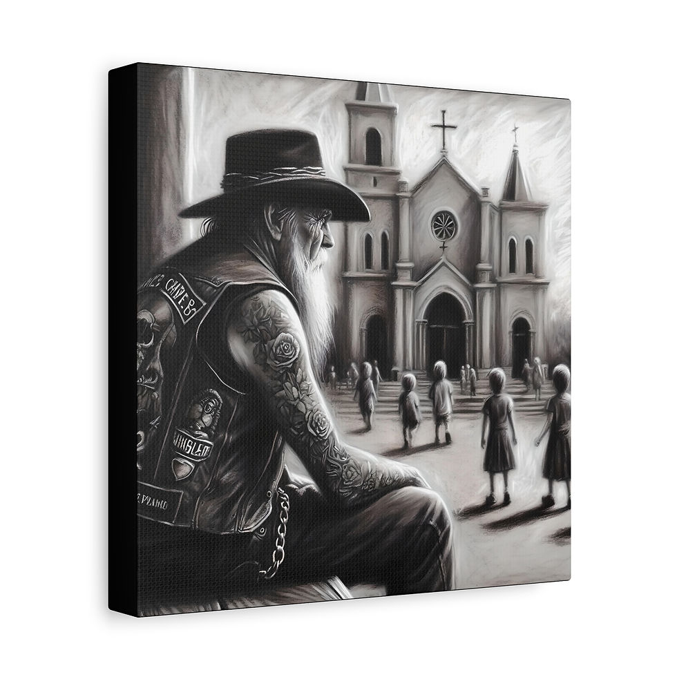 Matte Canvas, Old Biker outside a Church Motorcycle wall art Stretched, 1.25"